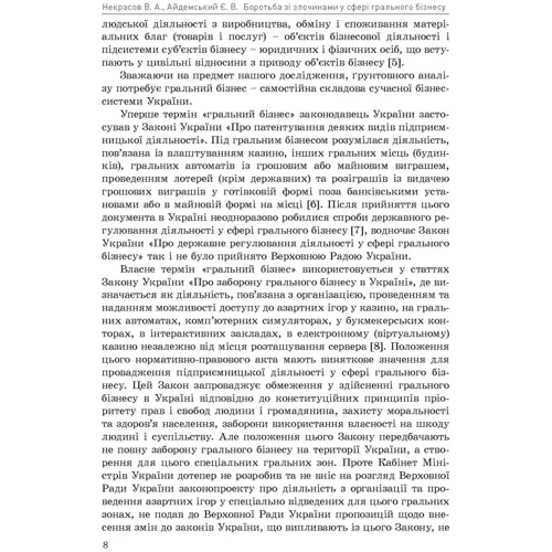 Висвітлено авторське бачення сутності, специфіки впливу й перспектив подальшої трансформації системи законодавчих і підзаконних актів на суспільні відносини, що виникають у зв’язку з припиненням протиправної діяльності з організації та проведення азартних ігор. Окреслено способи підвищення ефективності діяльності ОВС та ПМ із запобігання злочинам у сфері грального бізнесу, а також підходи щодо розуміння оперативної обстановки у сфері грального бізнесу, структурної будови характеру взаємозв’язків між підрозділами ПЗуСЕ та податкової міліції в системі протидії злочинам у сфері грального бізнесу. Визначено форми та напрями впливу злочинних угруповань на сферу грального бізнесу.