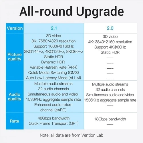 Кабель последнего поколения Vention HDMI 2.1 (AAL) имеет 3-х кратное увеличение пропускной способности до 48 Гбит/с (по кабелям стандарта HDMI 2.0 с пропускной способностью до 18 Гбит/с), поддержкой разрешения 8K (7680х4320) Ultra HD, технологии обновление (VRR), динамического HDR и автоматической регулировки латентности.