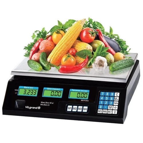 Весы электронные торговые Vilgrand – предназначены для взвешивания товара в магазинах и различных торговых точках. Корпус весов изготовлен из пластика, платформа изготовлена из нержавеющей стали. Устройство имеет по три дисплея с каждой стороны для отображения полной информации по товару, продавцу и покупателю. Питание весов осуществляется от сети переменного тока 220 В или встроенного аккумулятора напряжением 6 В. Зарядка аккумуляторной батареи может происходить одновременно с работой весов. Из основных достоинств можно отметить небольшие габариты устройства, отличный внешний вид, простоту и удобство использования.