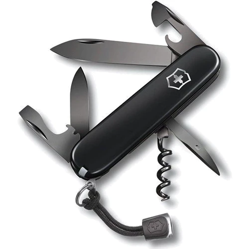 Новый нож из серии Spartan с инструментами темного цвета. Такой цвет достигается путем специальной электрохимической окраски металла (Polispectral). Цвет инструментов может выглядеть по-разному – от темно-серого до антрацитового – в зависимости от того, как падает свет. Лезвия отличаются зеркально-гладкой поверхностью с необычным мерцающим эффектом. Для контраста с холодной монохромной рукояткой к этому швейцарскому армейскому ножу добавлен черный темляк.