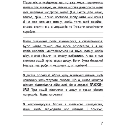 Тут він знаходить величезне НЛО, навколо якого кишать моби. Та найстрашніше те, що тут його атакують ендермени!Але й без хороших новин не обходиться — Вімпі дізнається, що тут є можливість скрафтити ТОРТ. Ось лишень інгредієнтів чимало треба назбирати, а це виявляється не так уже й легко. Для дітей, які полюбляють Майнкрафт.