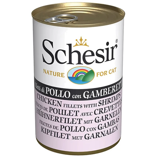 Влажный корм для кошек Schesir Chicken with Shrimps – 100% натуральные консервы из куриного филе и креветками в нежном желе. С добавкой витаминов и таурина. Приготовлен на пару. Без ароматизаторов, красителей и консервантов.