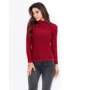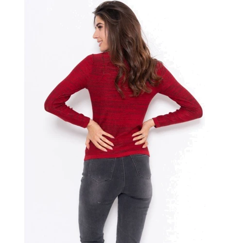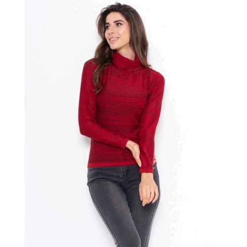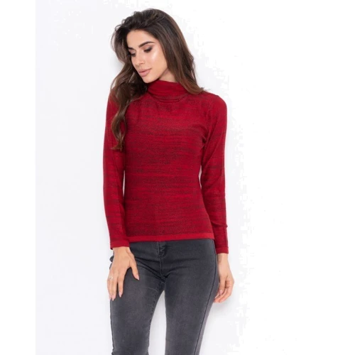 Красная тонкая водолазка из меланжевого комбинированного трикотажа с люрексом. Модель прямого приталенного кроя с длинными рукавами и высоким фактурным воротником-гольфом.