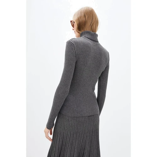 Классическая вязаная водолазка. Изделие выполнено из мягкой пряжи с содержанием вискозы. Вязка резинкой. Воротник-стойка. Длинные рукава.