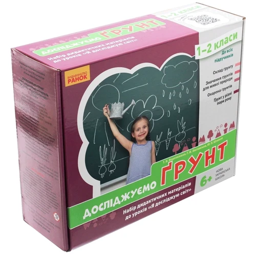 «Досліджуємо ґрунт» — один із наборів дидактичних матеріалів, що входить до серії «Досліджуємо світ природи». Набір створено для введення дитини у світ науки в цікавій ігровій формі, набуття нею досвіду перших відкриттів у світі природи, пошуку відповідей на численні «чому?». Набір дидактичних матеріалів не тільки зацікавить школярів та вчителів, але й стане помічником на уроках і в сімейних розвагах та дитячих іграх..