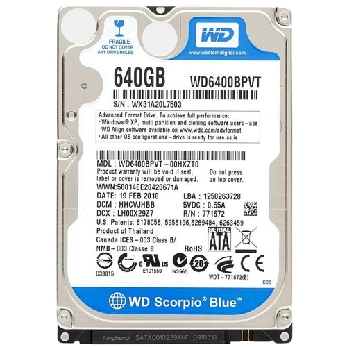 HDD-диск для ноутбуков Scorpio Blue 640 GB 2.5 (WD6400BPVT) от Western Digital поможет значительно расширить место ноутбука. Модель подойдет, в первую очередь, для сохранения объемных данных, но, конечно, подойдет и для других пользовательских и системных файлов. Отличный выбор, если вы хотите улучшить свой ноутбук и увеличить объем памяти до 640 Гб с буфером 8 Мб. Диск HDD позволит вам поставить знаменитые стабильность устройств Western Digital на службу вашему лэптопу и вам лично.