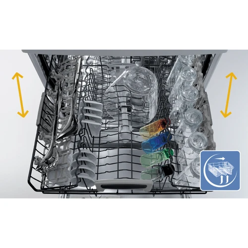 # Регулируемая верхняя корзина Сантиметры важны Если в вашей посудомоечной машине недостаточно места для грязной посуды после большого семейного обеда, используйте функцию регулировки верхней корзины, которая позволит вам получить дополнительное пространство.