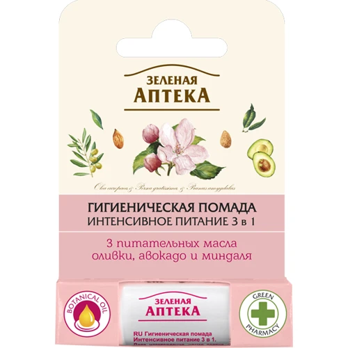 Нежная кожа губ такая чувствительная к воздействию внешних факторов, поэтому для того, чтобы уста оставались здоровыми и выглядели привлекательно, обеспечьте им заботливый уход. Гигиеническая помада «Интенсивное питание 3 в 1», разработанная косметологами известного бренда «Зеленая аптека» великолепно позаботится о коже губ как жарким летом, так и холодной зимой. Средство отличается увлажняющими, питательными и восстанавливающими свойствами.