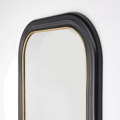 Тонкая золотистая линия вдоль внутреннего края матово-черной рамы придает зеркалу элегантный вид.