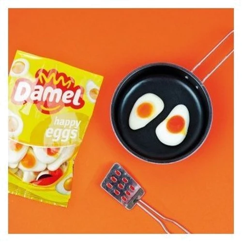Жевательные Конфеты Damel Happy Eggs сделаны в Испании. Их название переводится как «счастливые яйца». Эти фигурные конфеты изготовлены на основе желатина и не имеют в своём составе глютена.Damel Happy Eggs имеют небольшую форму, очень схожую на популярное блюдо, знакомое всем — яичницу. У них кисло-сладкий вкус, а белок обладает сливочными нотками. Реалистичность этих конфеток вызывает интерес и нравится детям. Ведь эти вкусные яичницы можно не только есть, но и «угощать» ими свои любимые игрушки. Они устойчивы к разной температурной среде, не тают и не деформируются в руках, хорошо сохраняют свою форму. Их можно брать с собой в дорогу или в гости. Они отлично развлекут ребёнка в пути и послужат приятным дозированным лакомством.