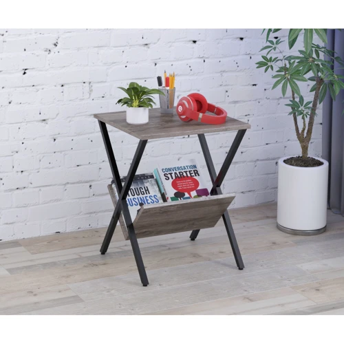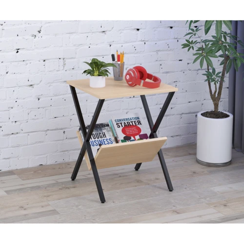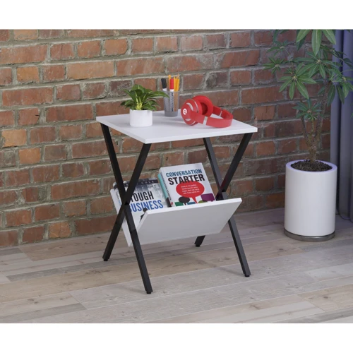 Столешницы изготовлены из качественного, прочного и эстетически привлекательного ЛДСП. Основная верхняя столешница прямая, квадратной формы. Внизу полочка V-образная, для хранения журналов, книг и другой печатной продукции.