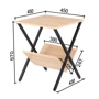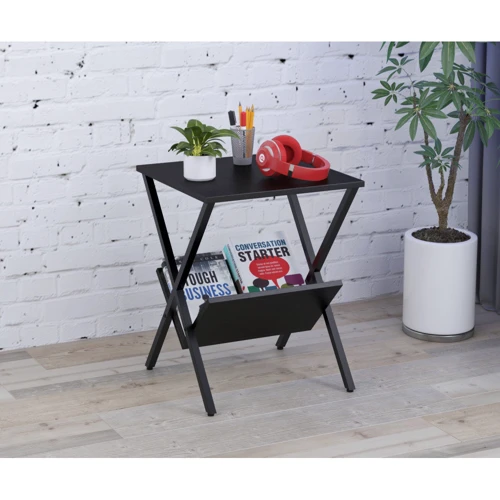 Столик состоит из разборного металлического каркаса, столешницы и нижней полки. Основание изготовлено из металлических труб 20х20 мм. Металл окрашен в черный цвет, методом порошкового напыления. Благодаря такому покрытию поверхность металла выглядит более эстетично и имеет длительный срок службы.