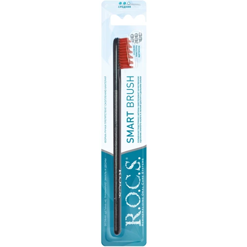 Уникальная форма головки зубной щетки R.O.C.S. — скошенная к концу головки щётки подстрижка щетины — повышает качество чистки поверхности зубов и позволяет с легкостью проникать в труднодоступные участки зубного ряда, а так же качественно очищать пространство между зубами, не повреждая десны. Тонкая плоская прозрачная ручка обеспечивает необычайную маневренность на всех участках зубного ряда. Нестандартная разноуровневая пострижка щетины облегчает проникновение к труднодоступным участкам полости рта и повышает качество очищения дальних зубов, небной и язычной поверхностей зубов.